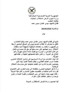 كما جدد البيان دعوة المجتمع الدولي و منظماته الى حمل المغرب على الاستجابة لقرارات الامم المتحدة و مقتضيات حقوق الانسان و الشرعية الدولية ، وإليكم نص البيان