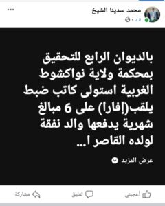 المحامي ولد الشيخ قال عبر تدوينه إن كاتب الضبط بالديوان الرابع بالمحكمة ولاية انواكشوط الغربية المكلف بقضايا القصر قام بسرقة نفقة قاصر مصاب بمرض التوحد وان العملية تكررر مرات عد خلال الأشهر الستة الماضية.