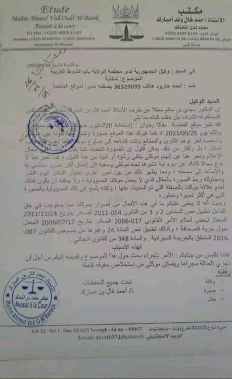 تقدم الوزير الناطق الرسمي باسم الحكومة سيدي ولد سالم بشكوى من وكالة الاخبار انفو ، إلى وكيل الجمهورية بولاية انواكشوط الغربية في تلك الشكوى يتهم مديرها الناشر بنشر الاكاذيب و استهدافه شخصيا .