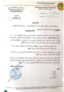 وشدد التعميم على أنه يجب أن يستوفي المتقدم الشروط المؤهلة للحصول على حصة (كاستثمار أو نشاط في قطاع الصيد مرتبط بالإنتاج)، وأن يكون بدء تشغيل إذن الإيجار 30 يوما من تاريخ توقيع الإذن، وأن يدفع حقوق الولوج إلى الثروة، وأن يتم إرسال احصائيات الصيد بشكل دوري إلى الجهات المعنية بالاستغلال (خفر السواحل والإدارة العامة لإدارة استغلال الثروات).