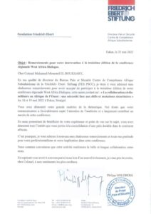 بعثت المؤسسة الألمانية فريدريك إيبيرت ستيفتينك, برسالة شكر وتقدير للخبير الموريتاني في الشؤون الإستراتيجية, العقيد المتقاعد البخاري محمد مؤمل على مشاركته في ندوة دولية نظمتها ,في العاصمة السينغالي دكار بتاريخ : 28 مايو 2022 تحت عنوان : التعاون المدني/العسكري في مواجهة التغير المناخي وجاء في نص الرسالة ان الخبير في الشؤون الاستراتيجي تمكن من الموضوع وجذب أنتباه المشاركين.