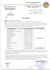 وفي المقابل أعلن الوزير في تعميم آخر صادر أمس الثلاثاء أنه وفي إطار تحديث نظام المعلومات الخاص بوزارة الصيد والاقتصاد البحري word flaw، يطلب من أصحاب الامتياز ومالكي سفن الصيد الراغبين في تجديد امتبازاتهم إكمال ملف لهذا الغرض.