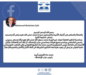 رئيس حزب “الإنصاف” محمد ماء العينين ولد أييه يهنئ بمناسبة ذكرى المولد النبوي الشريف شارك المنشور: شارك المنشور: