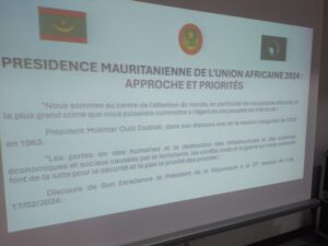 بعد ذلك تناول العرض أولويات الرئاسة الموريتانية للاتحاد المتمثلة في الأمن و الاستقرار، التعليم، الشباب، المرأة والحضور الفاعل و القوي للقارة الإفريقية في المحافل الدولية، كل ذلك في إطار أجندة إفريقيا 2063.