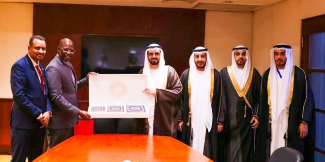 وقد أهدى رئيس الهيئة العامة للشؤون الإسلامية بالإمارات العربية المتحدة لمعالي الوزير نسخة من المصحف الشريف (طبعة الإمارات)
