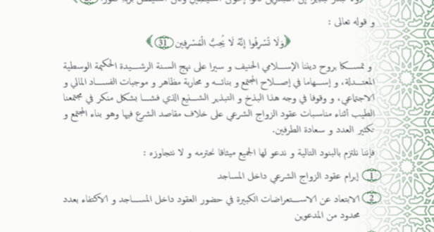 ودعا الميثاق إلى إبرام عقود الزواج داخل المساجد، والابتعاد عن الاستعراضات في الحضور، والاكفاء بعدد محدود من المدعوين، والامتناع عن البذخ والإسراف والمباهاة في الهدايا والعطاءات بين الطرفين