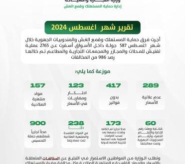 أجرت فرق حماية المستهلك وقمع الغش والمندوبيات الجهوية خلال شهر اغسطس 587 جولة داخل الأسواق أسفرت عن 2765 عملية تفتيش للمحلات والمجازر والمجمعات التجارية والمطاعم تم خلالها رصد 986 من المخالفات موزعة كما يلي :
