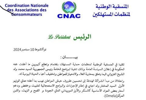 أشادت المنسقية الوطنية لمنظمات حماية المستهلك بالتدابير التي اعتمدتها الحكومة مؤخرًا؛ معتبرة أنها تندرج ضمن برنامج الرئيس محمد ولد الشيخ الغزواني، الرامي إلى تحسين الظروف المعيشية للمواطنين والتخفيف من ظروف عيشهم.