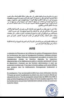 استدعت وزارة التربية المعلمين و الأساتذة الذين لم يمض على التحاقهم بالخدمة 15سنة و الذين يشتغلون كمساعدين في الوزارة و الادارات الجهوية و المفتشيات و لا تستند لهم وظائف محددة