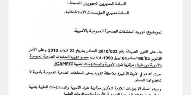 وأوضحت الوزارة في تعميم لها بالإلزام بتزويد الأدوية حصراً من المركزية لشراء الأدوية، وذلك وفقا لقانون الصيدلة رقم: 2010/022 الصادر بتاريخ 22 فبراير 2010، وعلى الأمر القانوني 90/04 الصادر 04 إبريل 1990.