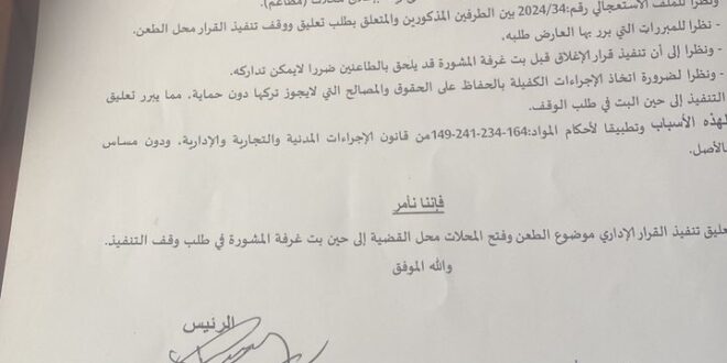 أمر رئيس الغرفة الإدارية في المحكمة العليا القاضي سليمان محمد عمر بتعليق القرار الصادر عن بلدية تفرغ زينة، والقاضي بإغلاق مجموعة من المطاعم تقع في البلدية، وتحديدا في المنطقة بين أتاك الخير رقم: 1 وسانتر متير.