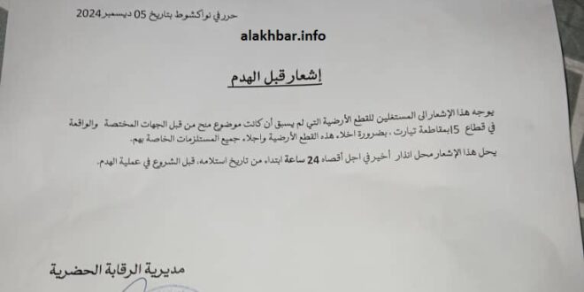 تستعد فرق من مديرية الرقابة الحضرية التابعة لوزارة الإسكان والعمران والاستصلاح الترابي لهدم عشرات المنازل السبت 07 – 12 – 2024 في منطقتين بالعاصمة نواكشوط، إحداهما في مقاطعة تيارت، والثانية في تفرغ، فيما تم التراجع عن قرار هدم منازل في منطقة ثالثة على الشاطئ.