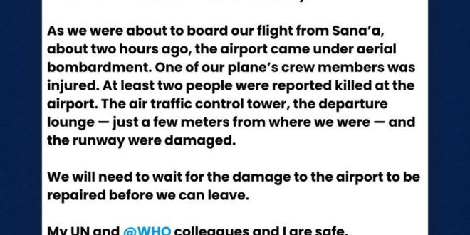 أعلن مدير منظمة الصحة العالمية تيدروس أدهانوم غيبريسوس أنه لم يصب، هو أو أفراد بعثة الأمم المتحدة، بأذى جراء القصف الإسرائيلي الذي استهدف مطار صنعاء الدولي اليوم الخميس، حين كانوا يهمّون بركوب طائرتهم لمغادرة العاصمة اليمنية، وأفاد بإصابة أحد أفراد طاقم الطائرة.