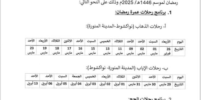 أعلنت شركة الموريتانية للطيران، عن برنامج رحلاتها الخاص بالحج وبعمرة رمضان لموسم 1446 / 2025.