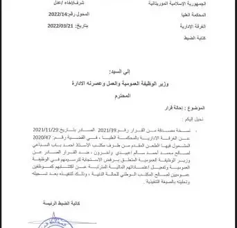 وأضاف الأطر أنهم تقدموا بطلب لتسوية وضعيتهم القانونية وسلكوا في هذا الصدد مختلف المراحل التي انتهت بالقرار رقم 39-2021 بتاريخ 29/11/2021 من الغرفة الإدارية بالمحكمة العليا والمحلى بصيغة التنفيذ مع إحالة من المحكمة إلى وزير الوظيفة العمومية للتنفيذ الذي لم يتم لحد الساعة، حسب البيان.