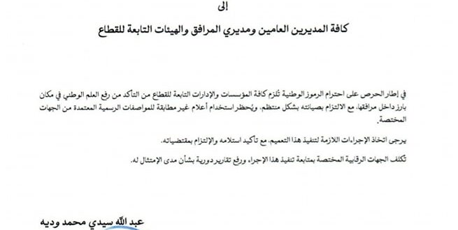 أصدر وزير الصحة عبد الله سيدي محمد وديه اليوم الأربعاء تعميما ألزم بموجبه إدارات القطاع بالتأكد من رفع العلم الوطني في مكان بارز داخل مرافقها، مع الالتزام بصيانته بشكل منتظم.