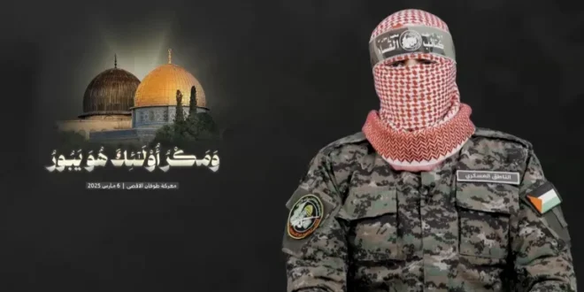 وفي كلمته المصورة الجديدة، ظهر أبو عبيدة على يمين الشاشة وإلى جانبه صورة للمسجد الأقصى وقبة الصخرة في الحرم القدسي الشريف وكتب تحت الصورة اقتباس من الآية العاشرة بسورة فاطر “ومكر أولئك هو يبور”.