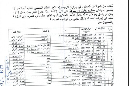 وجهت وزارة التربية وإصلاح النظام التعليمي، إنذارا لـ64 مدرسا، ملوحة بفصلهم في حال لم يحضروا لأماكن عملهم خلال 72 ساعة.