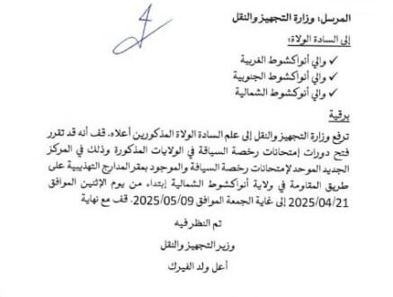 وقالت الوزارة في رسالة وجهتها إلى ولاة الولايات الثلاثة إن الامتحانات المقررة ستكون في المركز الجديد الموحد لإمتحانات رخصة السياقة والموجودة بمقر المدارج التهذيبية على طريق المقاومة في ولاية نواكشوط الشمالية .
