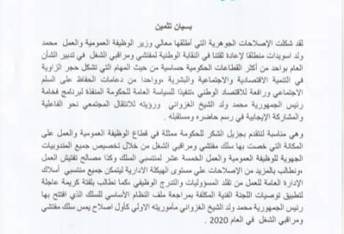 وهي مناسبة لنتقدم بجزيل الشكر للحكومة ممثلة في قطاع الوظيفة العمومية والعمل على المكانة التي خصت بها سلك مفتشي ومراقبي الشغل من خلال تخصيص جميع المندوبيات الجهوية للوظيفة العمومية والعمل الخمسة عشر لمنتسبي السلك وكذا مصالح تفتيش العمل ،ونطالب بالمزيد من الإصلاحات علي مستوى الهيكلة الادارية ليتمكن جميع منتسبي أسلاك الإدارة العامة للعمل من تقلد المسؤوليات والتدرج الوظيفي ،كما نطالب بلفتة كريمة عاجلة لتطبيق توصيات اللجنة الفنية المكلفة بمراجعة ملف النظام الأساسي للسلك الذي افتتح بها رئيس الجمهورية محمد ولد الشيخ الغزواني مأموريته الاولي كأول اصلاح يمس سلك مفتشي ومراقبي الشغل في العام 2020 .