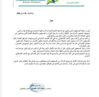 دعت رابطة الصحفيين الموريتانيين، اليوم الأحد، المجتمع الدولي إلى اتخاذ إجراءات فورية لوضع حد لجرائم الاحتلال في غزة، مؤكدة ضرورة التضامن مع الشعب الفلسطيني الأعزل.