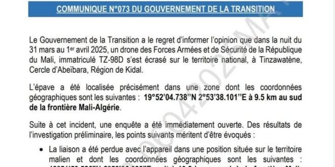 أعلنت السلطات المالية تقدمها بشكوى أمام الهيئات الدولية “ضد النظام الجزائري لارتكابه أعمالا عدوانية”، تمثلت في إسقاط الجزائر قبل أيام طائرة مسيرة تابعة للجيش المالي.