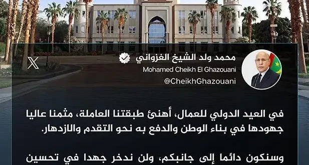 هنأ رئيس الجمهورية محمد ولد الشيخ الغزواني، في تغريدة له اليوم، أبناء الطبقة العاملة بمناسبة العيد الدولي للعمال.