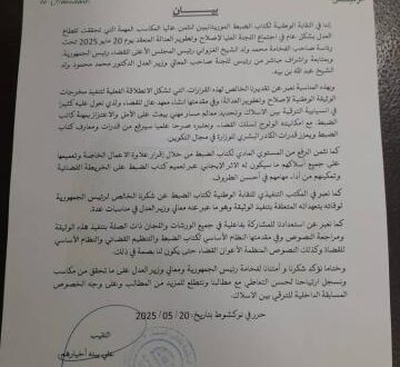 إننا في النقابة الوطنية لكتاب الضبط الموريتانيين لنثمن عاليا المكاسب المهمة التي تحققت لقطاع العدل بشكل عام في اجتماع اللجنة العليا لإصلاح وتطوير العدالة المنعقد يوم 20 مايو 2025 تحت رئاسة صاحب الفخامة محمد ولد الشيخ الغزواني رئيس المجلس الأعلى للقضاء رئيس الجمهورية، وبمتابعة واشراف مباشر من رئيس للجنة صاحب المعالي وزير العدل الدكتور محمد محمود ولد الشيخ عبد الله بن بيه.