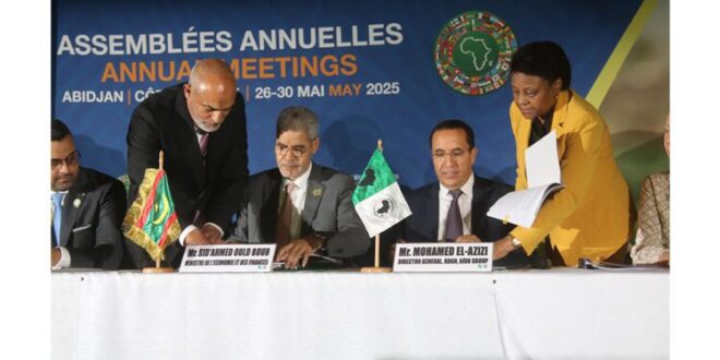 وقع معالي وزير الاقتصاد والمالية السيد سيد أحمد ولد أبُوه، اليوم الأربعاء في أبيدجان بكوت ديفوار، مع السيد محمد عزيزي، المدير العام الإقليمي لمنطقة شمال إفريقيا بالبنك الإفريقي للتنمية، ثلاث اتفاقيات تمويل بقيمة ما يناهز 30 مليون دولار أمريكي، وذلك على هامش الاجتماعات السنوية لمجموعة البنك الإفريقي للتنمية.