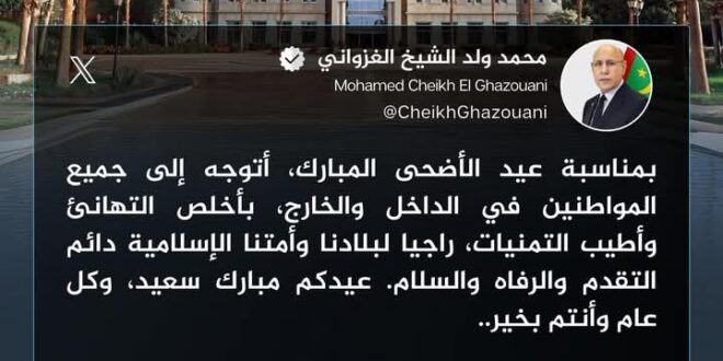 وهنأ ولد الغزواني في التغريدة المنشورة على حسابه في موقع “إكس” المواطنين الموريتانيين في الداخل والخارج بمناسبة عيد الأضحى المبارك.
