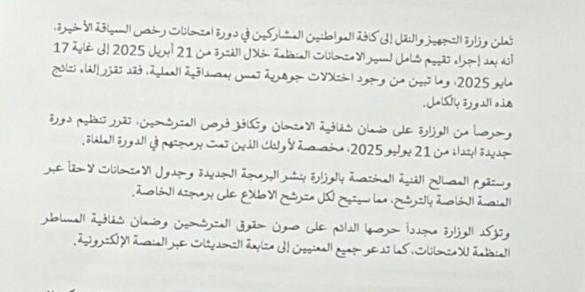 أعلنت وزارة التجهيز والنقل، إلغاء نتائج امتحانات رخص السياقة المنظمة خلال الفترة من 21 أبريل إلى 17 مايو 2025.