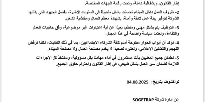 أصدرت شركة “Sogetrap” العاملة في ميناء نواكشوط المستقل، بيانًا توضيحيًا ردًا على ما وصفته بـ “الاتهامات والمعلومات غير الدقيقة” التي وردت في بيان للكونفدرالية الوطنية لعمال موريتانيا (CLTM) يوم 3 أغسطس الجاري، والمتعلق بتسيير اليد العاملة في الميناء.