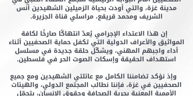 وجددت الشبكة تضامنها الكامل مع عائلتي الشهيدين وجميع الصحفيين في غزة، داعية المجتمع الدولي والهيئات الأممية المعنية بحرية الصحافة وحقوق الإنسان إلى تحمل مسؤولياتهم واتخاذ إجراءات عاجلة لوقف هذه الانتهاكات، وملاحقة مرتكبيها أمام المحاكم الدولية المختصة.