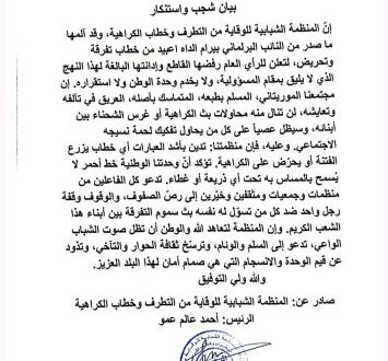 قالت المنظمة الشبابية للوقاية من التطرف وخطاب الكراهية إنها تشجب ما ورد في كلمة النائب بيرام الداه اعبيد، معتبرة أن مضمونها يصب في خانة خطاب الكراهية والتفرقة.