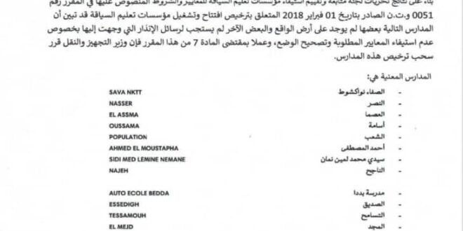 أصدرت وزارة التجهيز والنقل قرارًا يقضي بسحب تراخيص 17 مدرسة لتعليم السياقة.