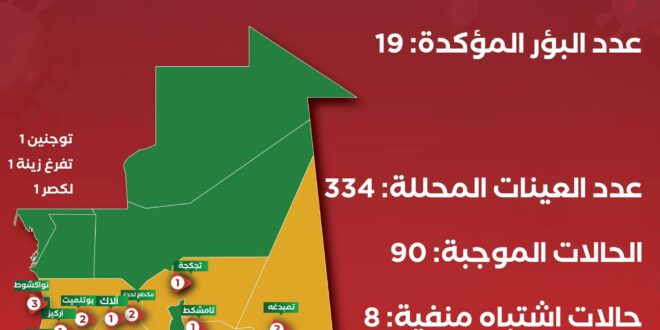 وأضافت أنه عند ظهور أول بؤرة رفعت المصالح المركزية والجهوية للوزارة درجة اليقظة وزادت من عمليات الرصد والتتبع والابلاغ السريع وأخذ العينات وإرسالها على وجه السرعة إلى المختبر المرجعي في نواكشوط لتأكيد الاشتباه أو نفيه.