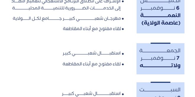 ووفق المصدر نفسه يشرف ولد الغزواني بعد استقباله غدا في عاصمة الولاية، النعمة على انطلاقة البرنامج الاستعجالي لتعميم النفاذ إلى الخدمات الضرورية للتنمية المحلية، يعقبه مهرجان شعبي جامع للولاية، ولقاء مفتوح مع سكان المقاطعة.