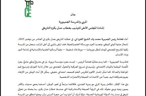 وأشاد المجلس بخطاب الرئيس محمد ولد الغزواني في عدل بكرو “بما يحمله من تحوّلٍ تاريخي في مسار بناء الدولة الموريتانية الحديثة، دولةٍ تُدرك أنّ أمنَها يبدأ من حجرة الدرْس، وأن نهضتَها تنطلق من المدرسة الجمهورية: منارة القيم، ومصنع المواطنة، ومِشعل الحضارة المتجددة” وفق بيان المجلس