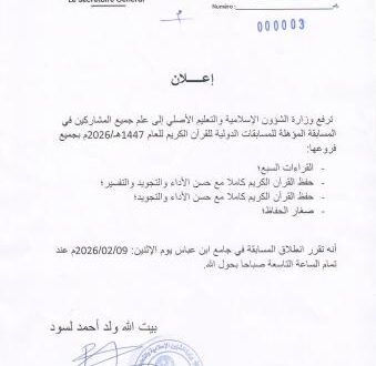 أعلنت وزارة الشؤون الإسلامية والتعليم الأصلي عن موعد المسابقة المؤهلة للمسابقات الدولية للقرآن الكريم للعام 1947 هـ / 2026 م .