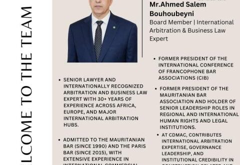 أعلن الرئيس السابق للجنة الوطنية لحقوق الانسان، أحمد سالم ولد بوحبيني التحاقه بمجلس إدارة المركز الدولي CDMAC، المتخصص في الوساطة والتحكيم وتسوية المنازعات.
