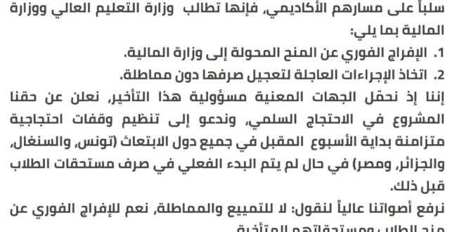 وحملت الهيئات الطلابية الجهات المعنية مسؤولية التأخير، مشددة على ضرورة الإفراج الفوري عن المنح، واتخاذ خطوات ملموسة لصرفها دون مماطلة.