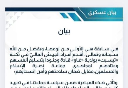 وأوضح البيان أن هذه الخطوة تندرج ضمن ما وصفته الجماعة بسياسة “تحييد من يطلب الحياد”، داعيةً بقية عناصر الجيش المالي في مختلف المعسكرات والتشكيلات إلى الاقتداء بهذه المبادرة وتسليم أنفسهم، مقابل ما اعتبرته ضمانًا لسلامتهم.
