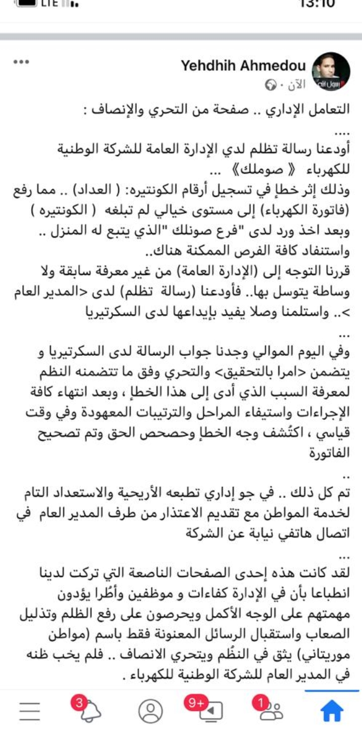 عبر العديد من المواطنين الموريتانين وزبناء الشركة الموريتانية للكهراباء عن ارتياحهم للسياسة الجديدة التى إتخذها المدير العام للشركة, المهندس الشيخ ولد بد والتى قوامها المهنية و الشفافية والتفاعل المباشر مع الجميع من خلال التظلم عبر السلم الإداري أو التفاعل بشكل مباشر مع المدير العام من خلال صفحته على الفيس بوك …