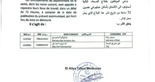 يدعى الموظفون بقطاع الصحة، التالية أسماؤهم، الى الإلتحاق بأماكن عملهم في غضون 72 ساعة من تاريخ نشر هذا البلاغ الذي يحل محل إنذار.