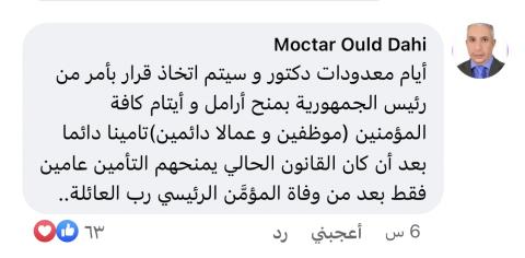 أعلن وزير الصحة المختار ولد داهي، أنه، وبأمر من الرئيس محمد ولد الشيخ الغزواني، سيتم خلال أيام قليلة اتخاذ قرار “بمنح أرامل و أيتام كافة المؤمنين (موظفين و عمالا دائمين) تأمينا دائما بعد أن كان القانون الحالي يمنحهم التأمين عامين فقط بعد من وفاة المؤمَّن الرئيسي رب العائلة..”. وكشف الوزير …