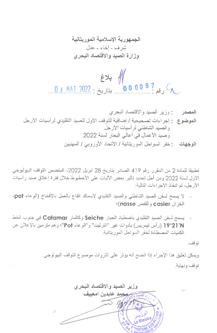 أعلن بلاغ لوزير الصيد والاقتصاد البحري محمد ولد امعييف عن إجراءات تصحيحية للتوقف البيولوجي الأول 2022 للصيد التقليدي لرأسيات الأرجل والصيد الشاطئي. وحسب البلاغ الصادر يوم أمس الأربعاء فإنه لا يسمح لسفن الصيد الشاطئي والصيد التقليدي لأسماك القاع بالعمل بالأفخاخ (الوعاء والخزان والقفص). ووفق التعميم فإنه يسمح لسفن الصيد التقليدي …