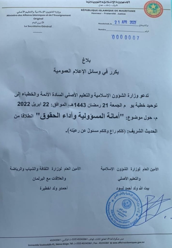 وزارة الشؤون الإسلامية توحد خطبة الجمعة حول أمانة المسؤولية وأداء الحقوق