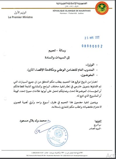 أصدر الوزير الأول محمد ولد بلال، تعميما لأعضاء الحكومة طلب فيه منهم التحقق من أن جميع السيارات التي تم اقتناؤها بتمويل خارجي في إطار تنفيذ مختلف البرامج والمشاريع تحمل على أبوابها علامات مميزة تحدد الهيئة أو المشروع الذي تتبع له. وأمهل الوزير الأول أعضاء الحكومة أسبوعا واحدا لتنفيذ مضمون هذا …
