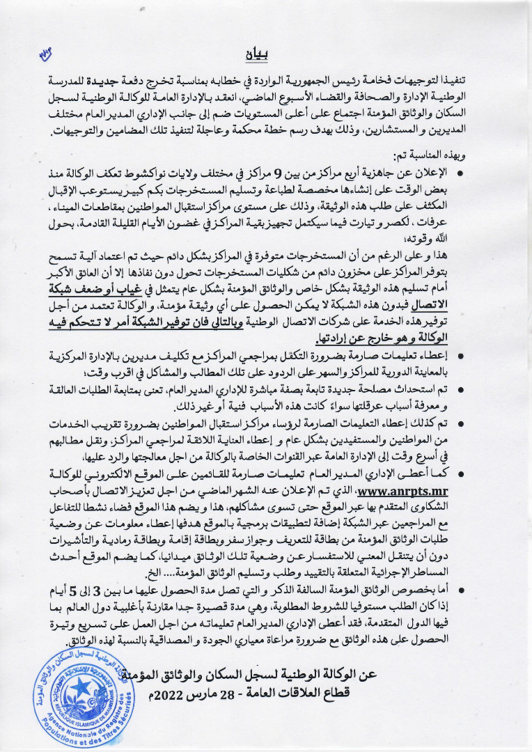 أعلنت الوكالة الوطنية لسجل السكان والوثائق المؤمنة، عن إجراءات جديدة، وذلك بعد أيام من كلمة للرئيس محمد ولد الغزواني انتقد فيها بشدة طريقة عمل هذه الإدارة. وأعلنت الإدارة العامة للوثائق المؤمنة في بيان، “جاهزية أربع مراكز من بين 9 مراكز في مختلف ولايات نواكشوط تعكف الوكالة منذ بعض الوقت على …