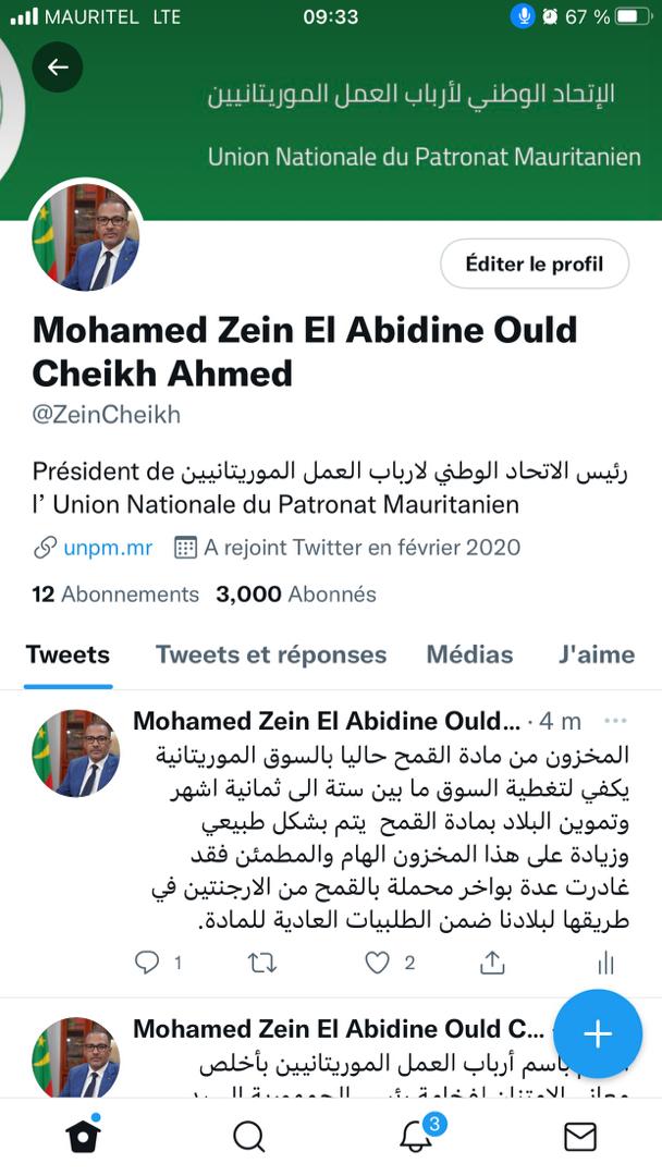 أكد محمد زين العابدين ولد الشيخ أحمد، رئيس اتحاد أرباب العمل الموريتانيين، أن مخزون البلاد من القمح “يكفي لفترة تمتد ما بين ستة إلى ثمانية أشهر قادمة”. وأوضح ولد الشيخ أحمد، في تغريدة نشرها عبر حسابه في تويتر، أن تموين البلاد من القمح “يتم بشكل طبيعي”، مشيرا أنه، وزيادة على …